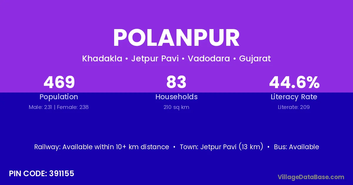 Jetpur Pavi (13 km) is the nearest town to Polanpur village for major economic activities and is located approximately 13 km away.