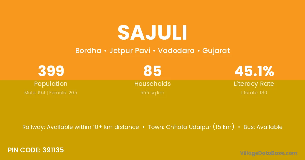 Chhota Udaipur (15 km) is the nearest town to Sajuli village for major economic activities and is located approximately 15 km away.