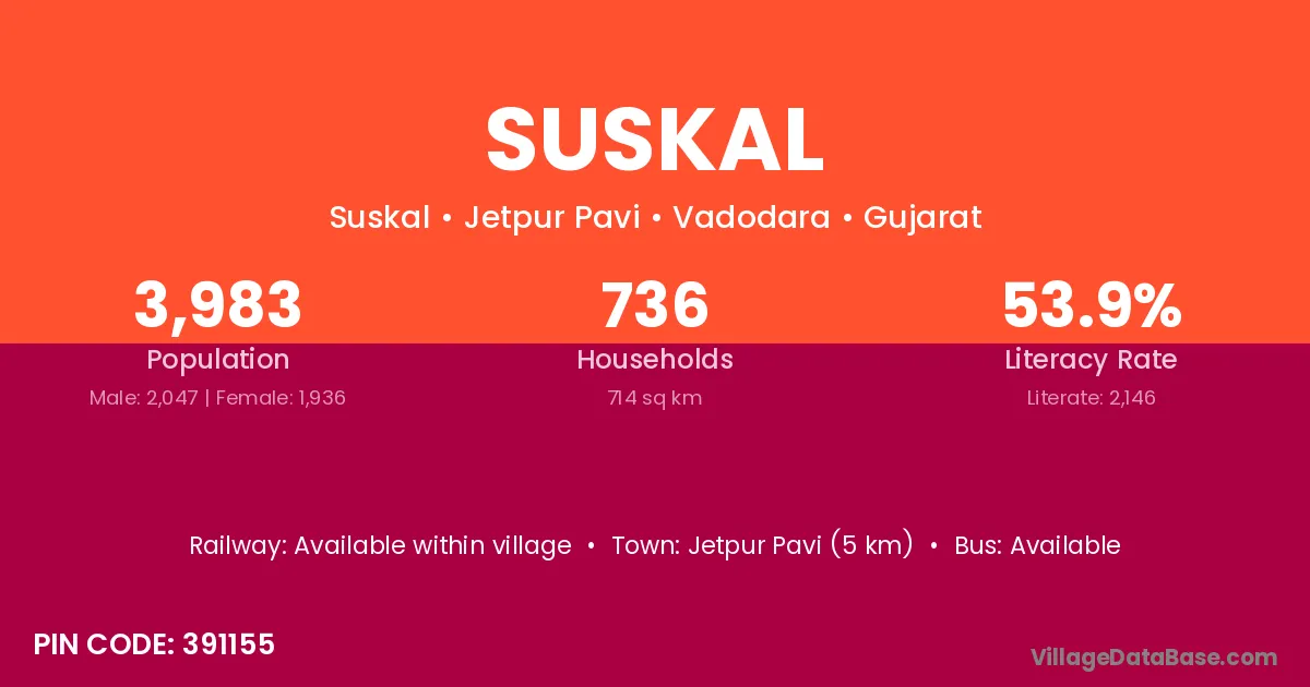 Jetpur Pavi (5 km) is the nearest town to Suskal village for major economic activities and is located approximately 5 km away.