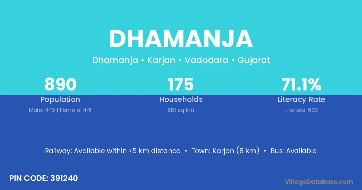 Karjan (8 km) is the nearest town to Dhamanja village for major economic activities and is located approximately 8 km away.