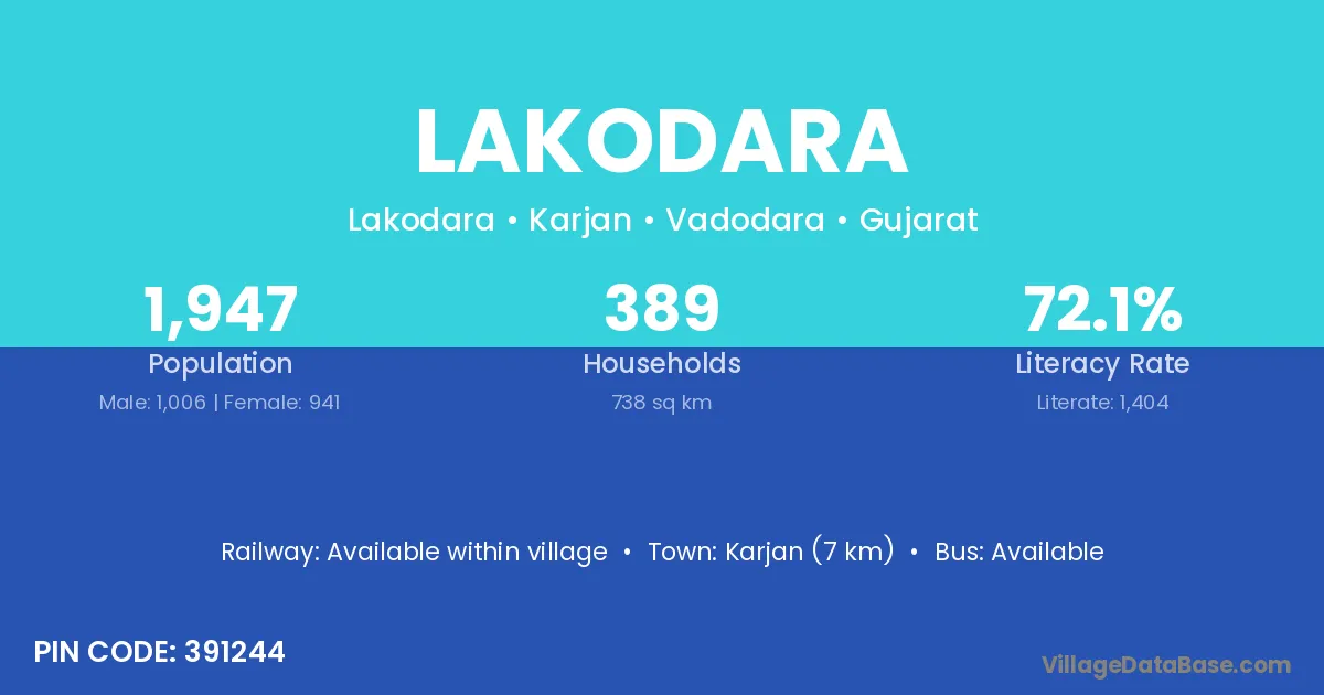 Karjan (7 km) is the nearest town to Lakodara village for major economic activities and is located approximately 7 km away.