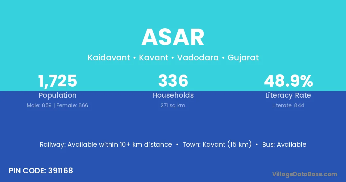 Kavant (15 km) is the nearest town to Asar village for major economic activities and is located approximately 15 km away.