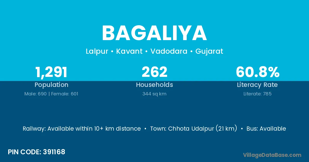 Chhota Udaipur (21 km) is the nearest town to Bagaliya village for major economic activities and is located approximately 21 km away.