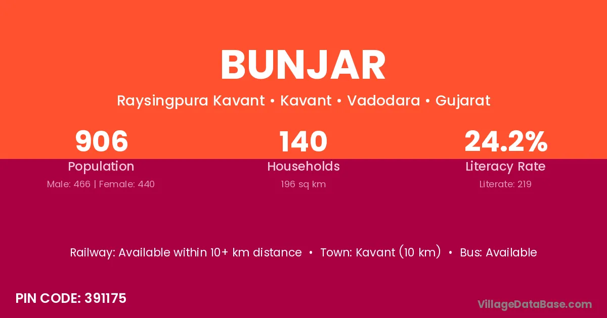 Kavant (10 km) is the nearest town to Bunjar village for major economic activities and is located approximately 10 km away.