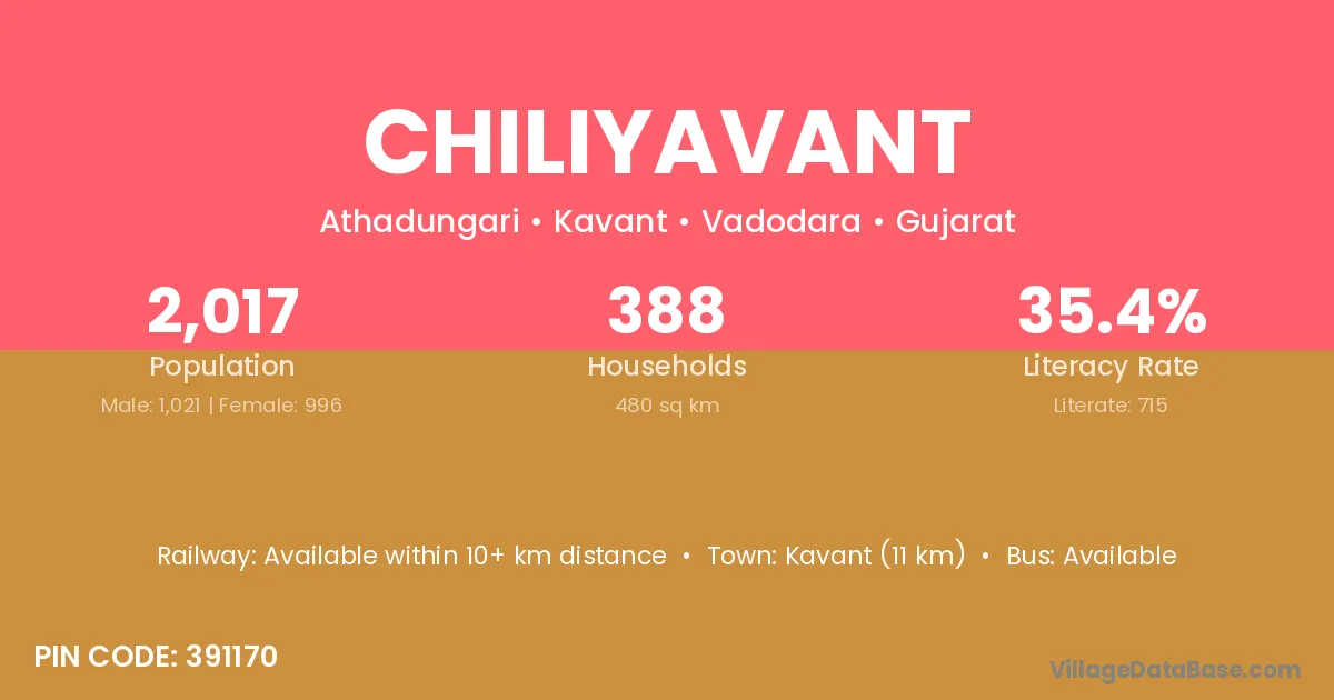 Chiliyavant village has a total population of 2,017 people, of which 1,021 are males and 996 are females.