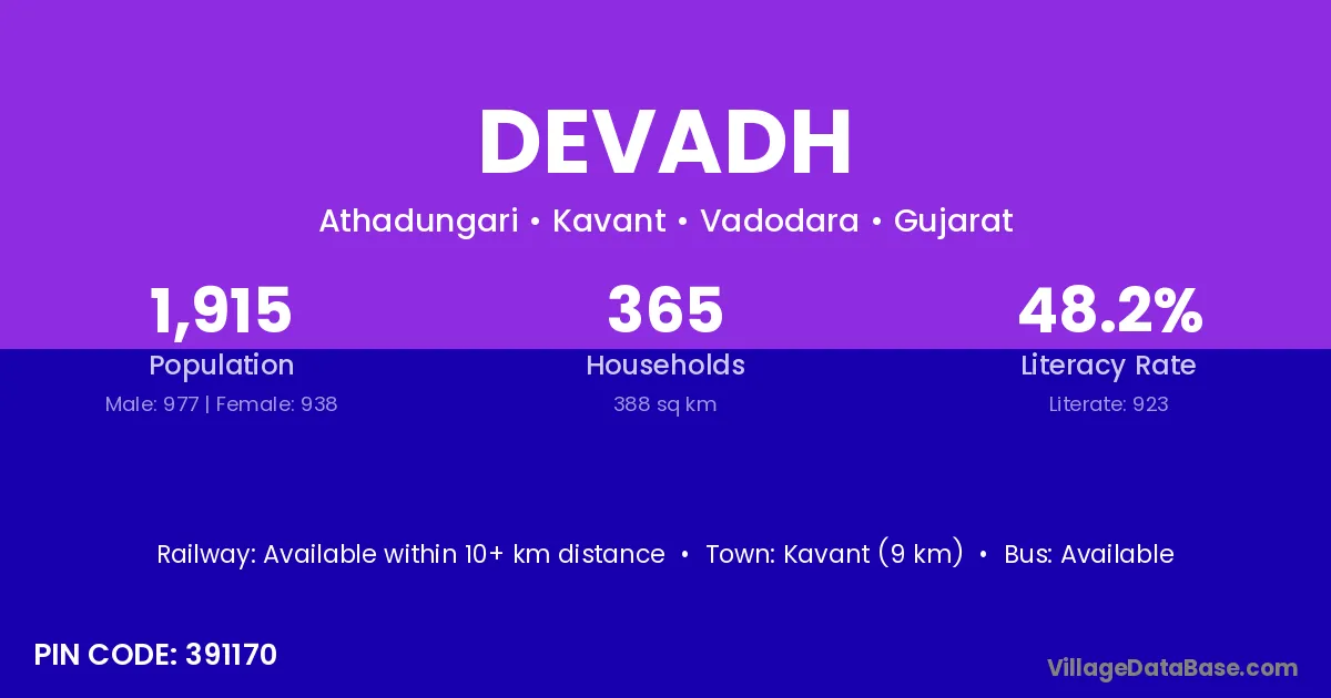 Kavant (9 km) is the nearest town to Devadh village for major economic activities and is located approximately 9 km away.