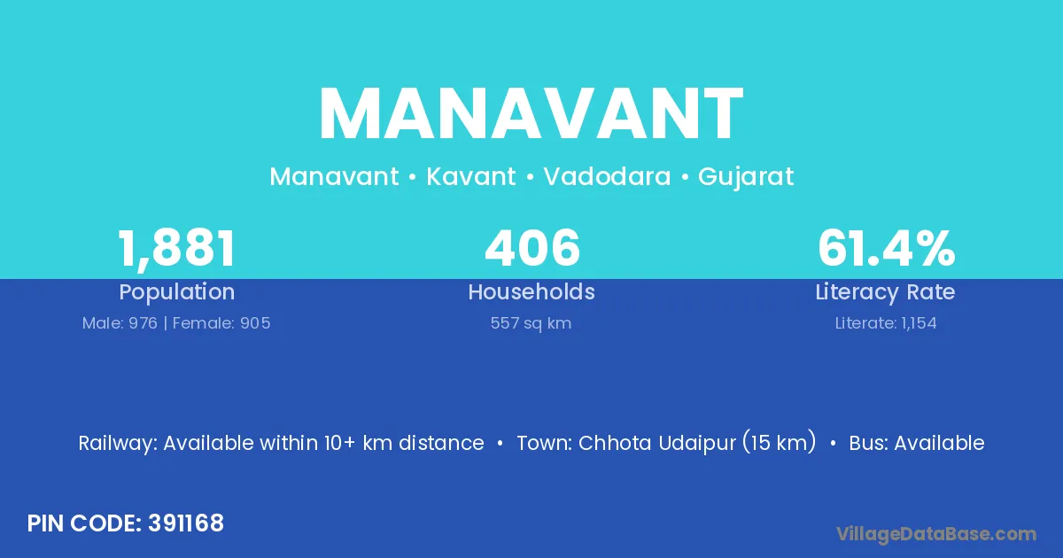 Chhota Udaipur (15 km) is the nearest town to Manavant village for major economic activities and is located approximately 15 km away.