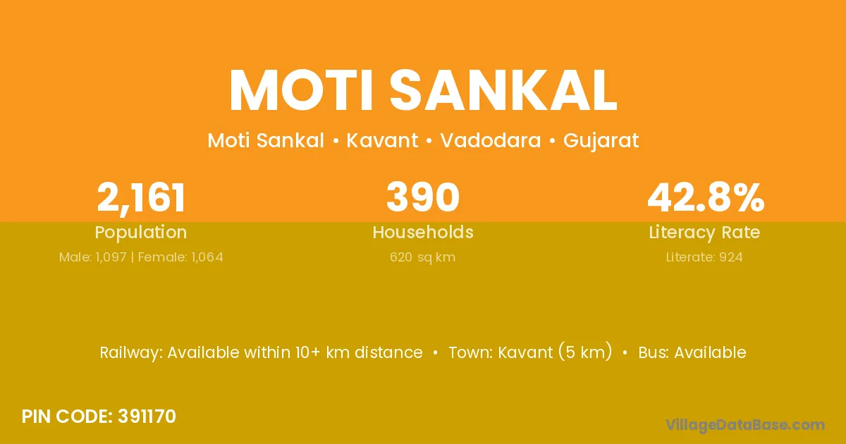 Kavant (5 km) is the nearest town to Moti Sankal village for major economic activities and is located approximately 5 km away.
