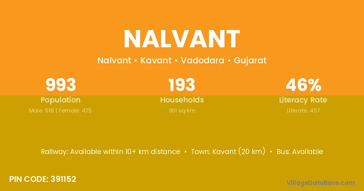 Kavant (20 km) is the nearest town to Nalvant village for major economic activities and is located approximately 20 km away.