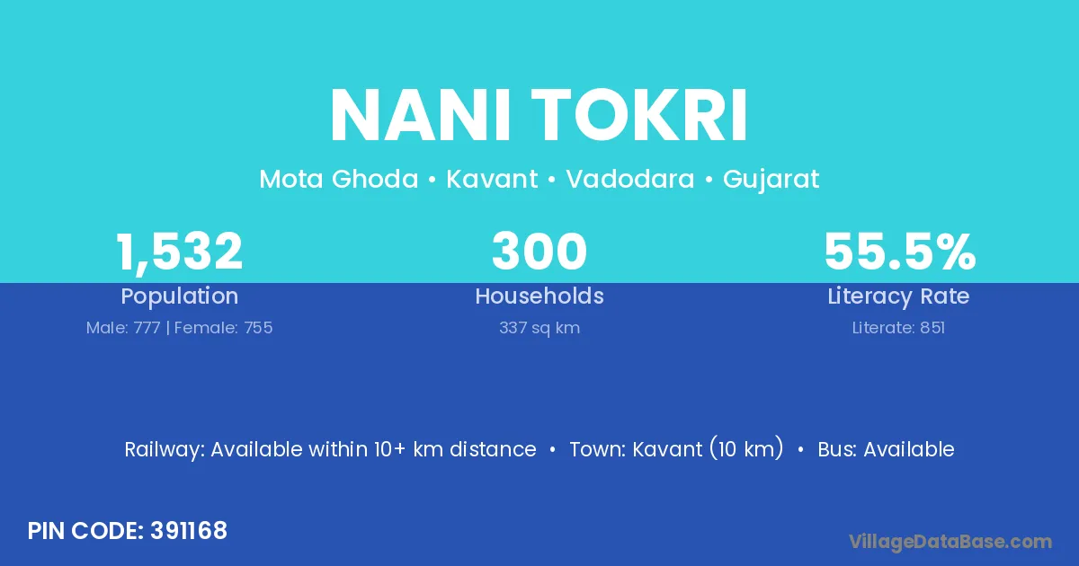 Kavant (10 km) is the nearest town to Nani Tokri village for major economic activities and is located approximately 10 km away.