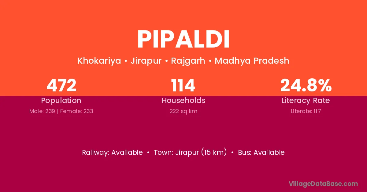 Pipaldi village has a total population of 1,923 people, of which 961 are males and 962 are females.