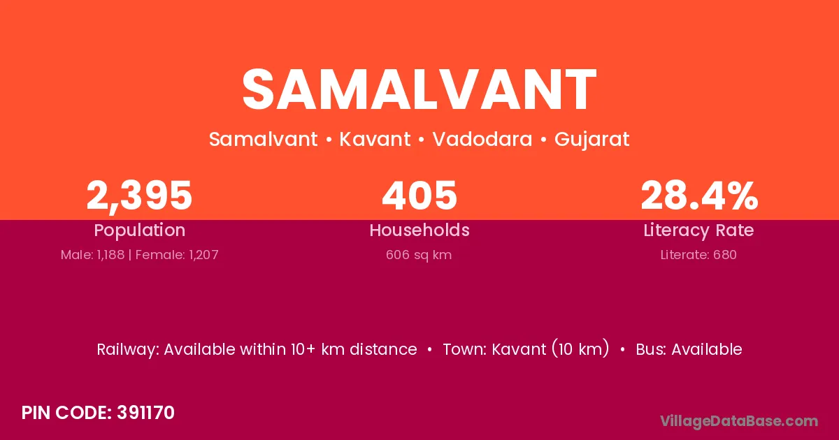 Kavant (10 km) is the nearest town to Samalvant village for major economic activities and is located approximately 10 km away.