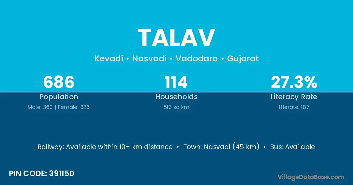 Kavant (7 km) is the nearest town to Talav village for major economic activities and is located approximately 7 km away.