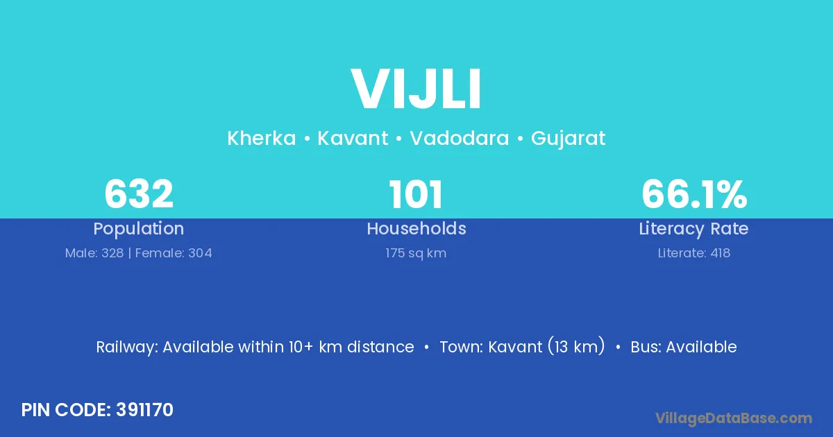 Kavant (13 km) is the nearest town to Vijli village for major economic activities and is located approximately 13 km away.
