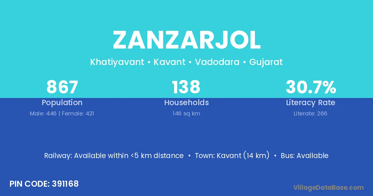 Kavant (14 km) is the nearest town to Zanzarjol village for major economic activities and is located approximately 14 km away.