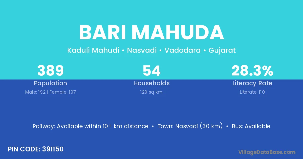 Nasvadi (30 km) is the nearest town to Bari Mahuda village for major economic activities and is located approximately 30 km away.