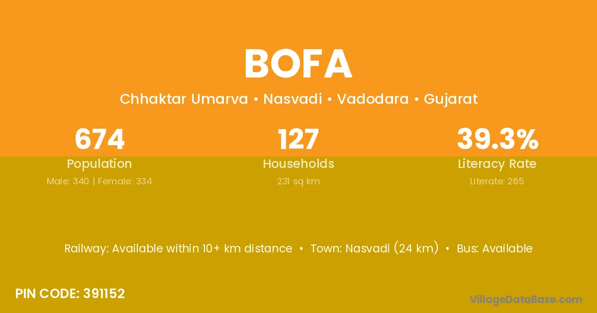 Bofa village has a total population of 674 people, of which 340 are males and 334 are females.