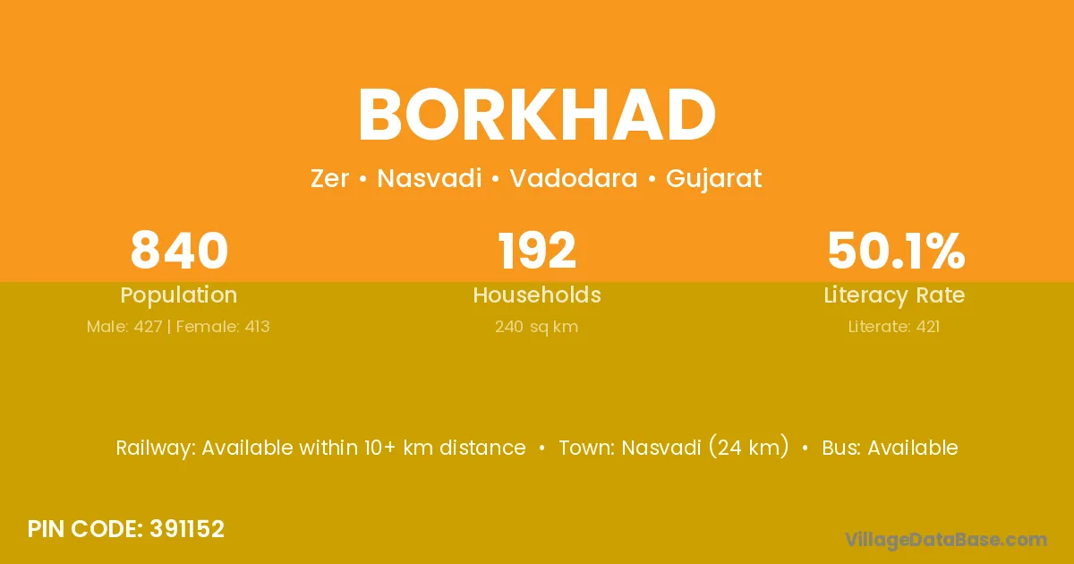 Nasvadi (24 km) is the nearest town to Borkhad village for major economic activities and is located approximately 24 km away.