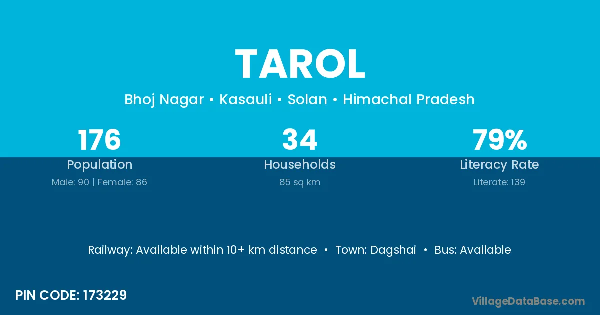 The literacy rate of Tarol village is 31.77%. Male literacy stands at 40.58% and female literacy at 23.27%.