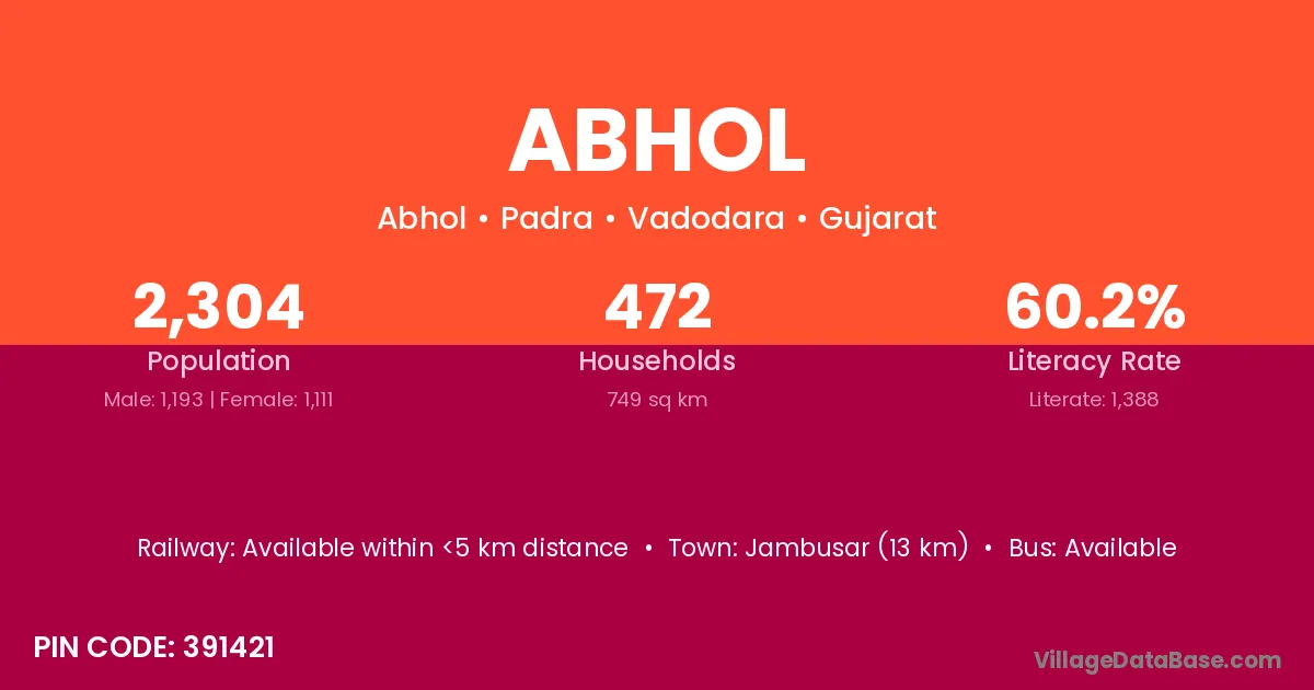 Jambusar (13 km) is the nearest town to Abhol village for major economic activities and is located approximately 13 km away.