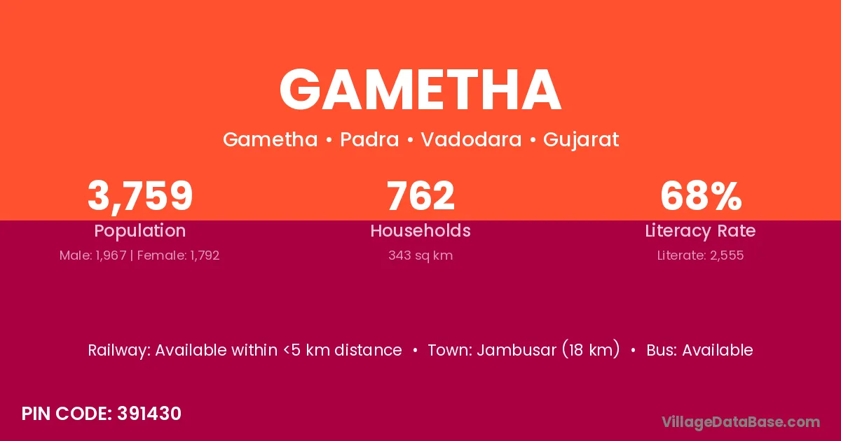 Jambusar (18 km) is the nearest town to Gametha village for major economic activities and is located approximately 18 km away.