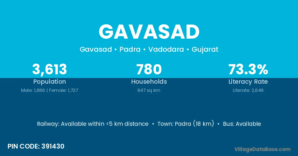Padra (18 km) is the nearest town to Gavasad village for major economic activities and is located approximately 18 km away.