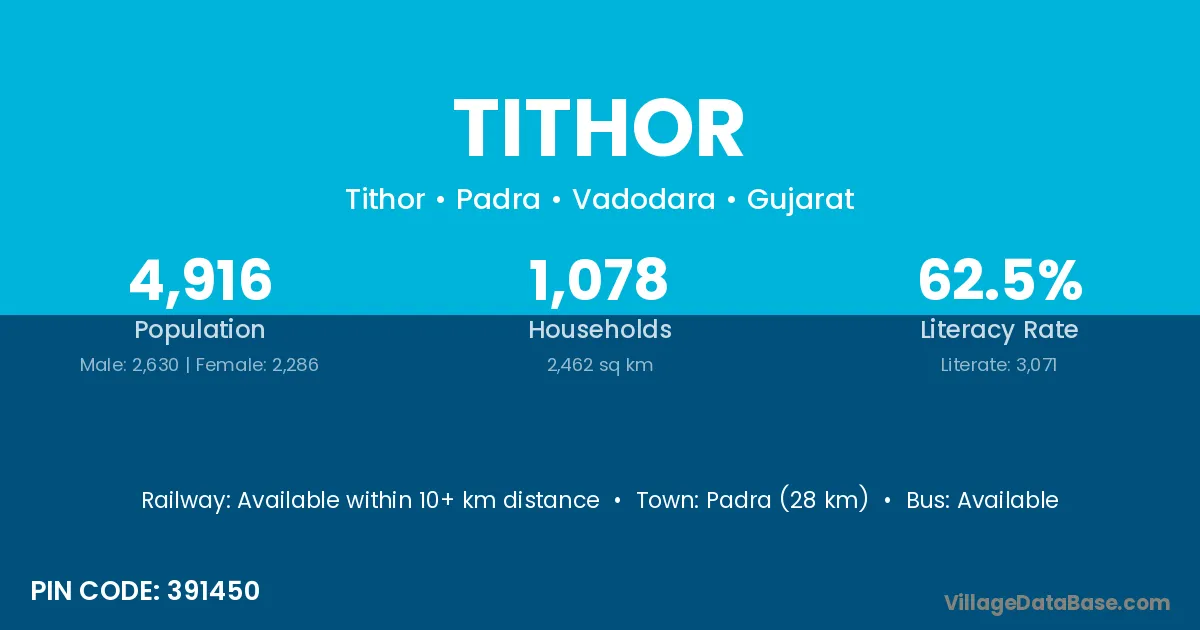 Padra (28 km) is the nearest town to Tithor village for major economic activities and is located approximately 28 km away.