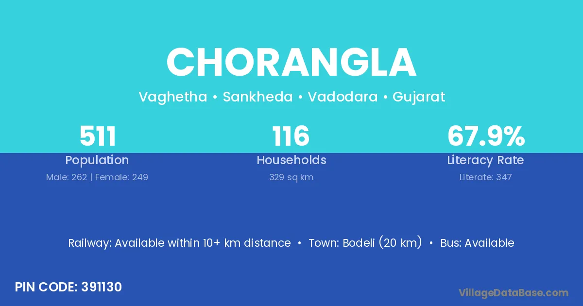 Chorangla village has a total population of 511 people, of which 262 are males and 249 are females.
