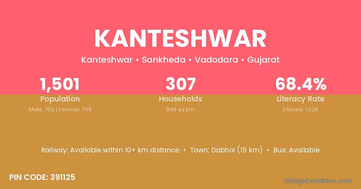 Dabhoi (15 km) is the nearest town to Kanteshwar village for major economic activities and is located approximately 15 km away.
