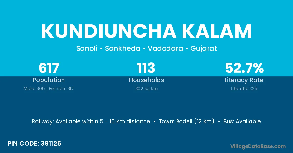 Bodeli (12 km) is the nearest town to Kundiuncha Kalam village for major economic activities and is located approximately 12 km away.