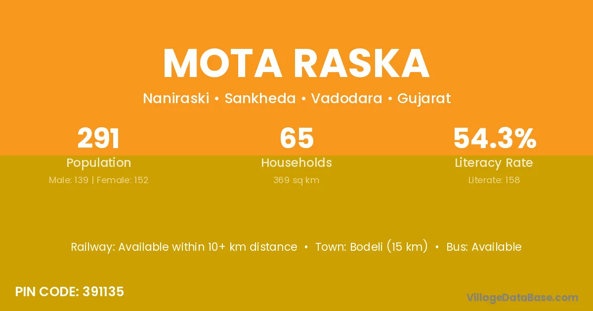 Bodeli (15 km) is the nearest town to Mota Raska village for major economic activities and is located approximately 15 km away.