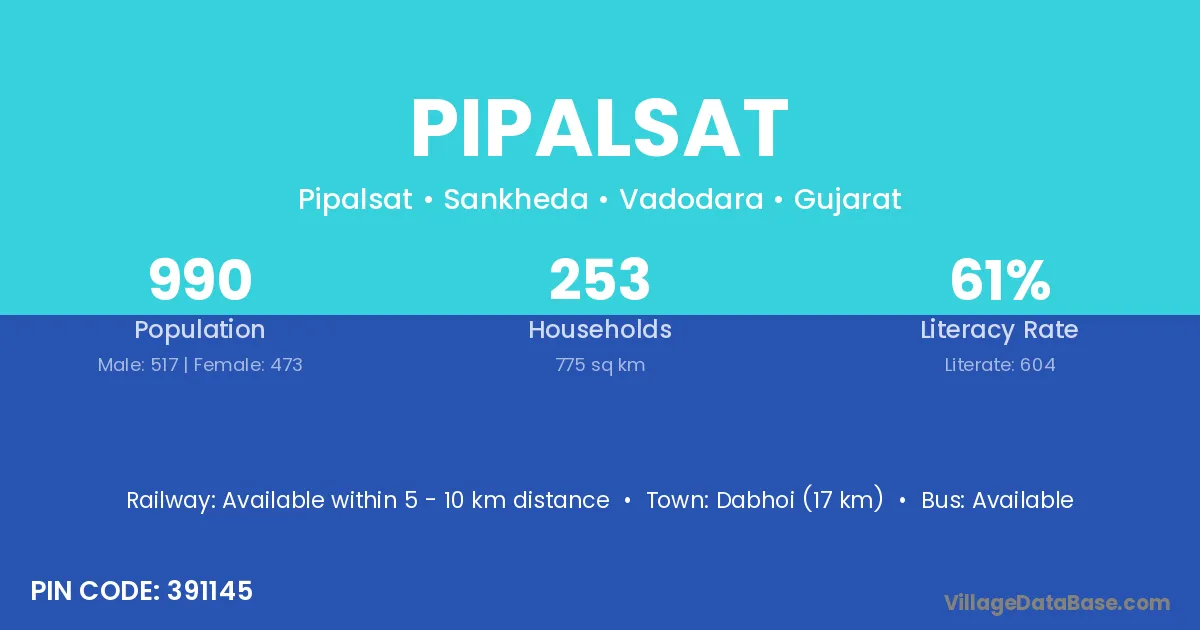 Dabhoi (17 km) is the nearest town to Pipalsat village for major economic activities and is located approximately 17 km away.