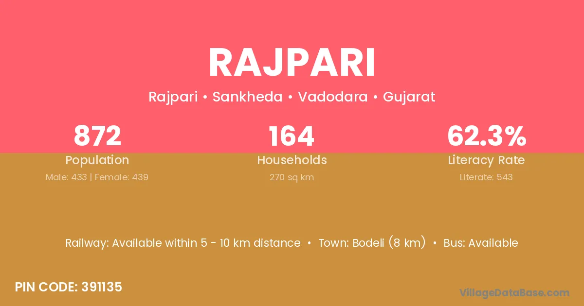 Bodeli (8 km) is the nearest town to Rajpari village for major economic activities and is located approximately 8 km away.