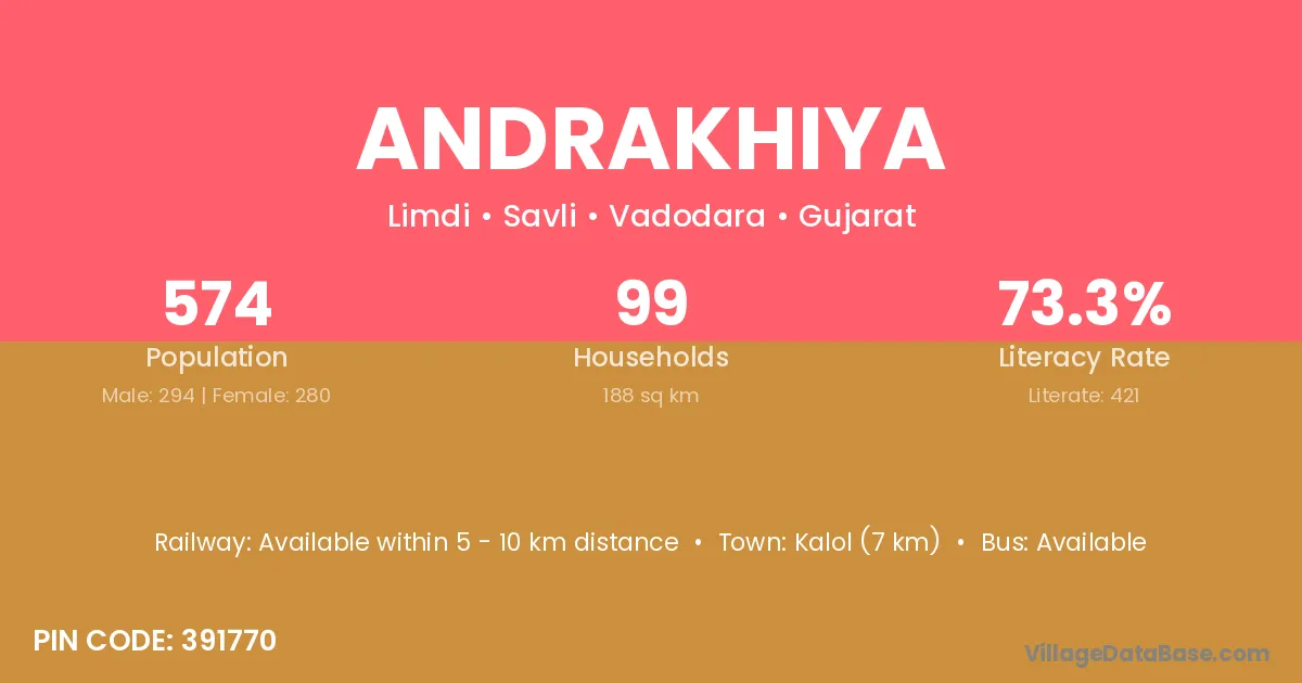 Kalol (7 km) is the nearest town to Andrakhiya village for major economic activities and is located approximately 7 km away.