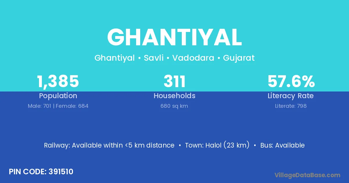 Halol (23 km) is the nearest town to Ghantiyal village for major economic activities and is located approximately 23 km away.