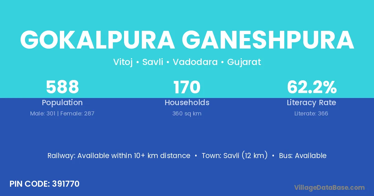 Savli (12 km) is the nearest town to Gokalpura Ganeshpura village for major economic activities and is located approximately 12 km away.
