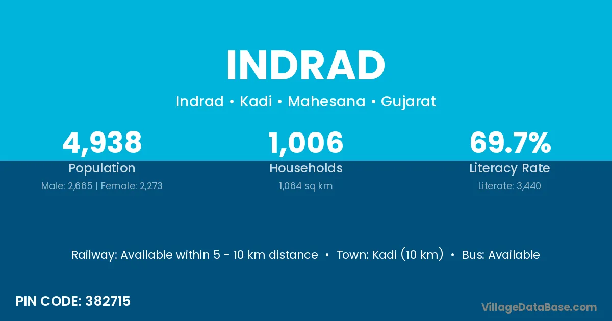 Savli (15 km) is the nearest town to Indrad village for major economic activities and is located approximately 15 km away.