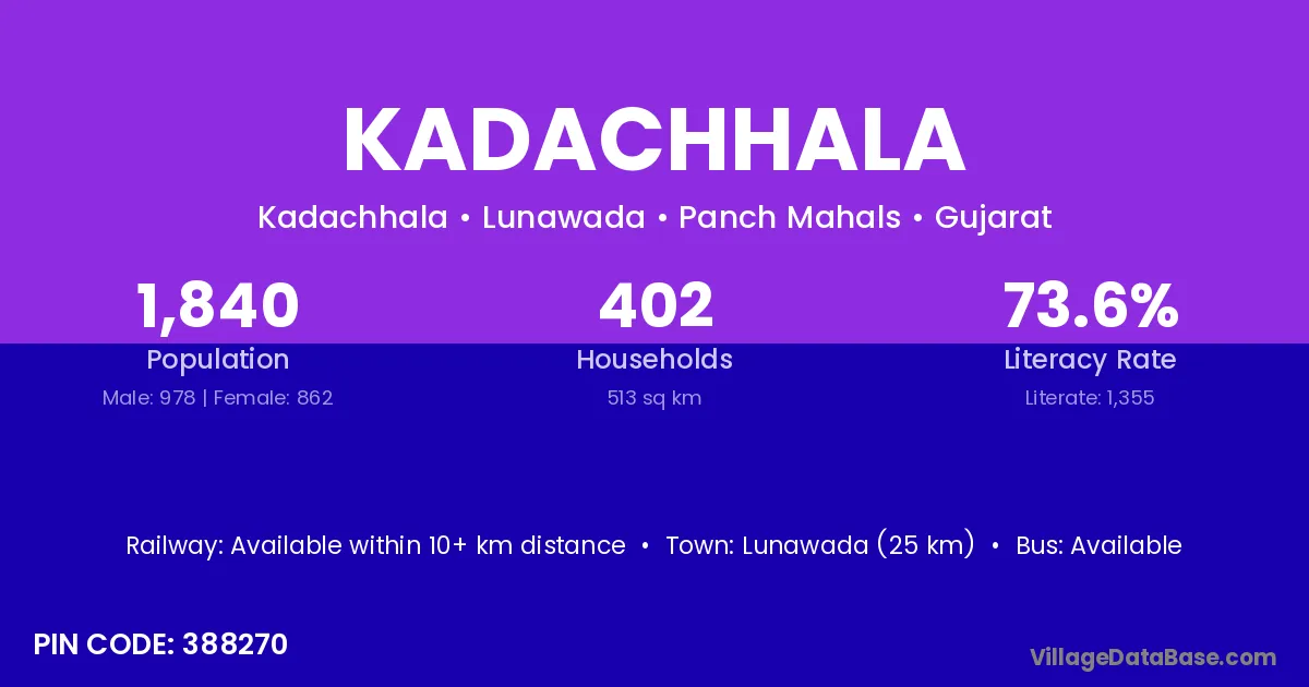 Kalol (17 km) is the nearest town to Kadachhala village for major economic activities and is located approximately 17 km away.