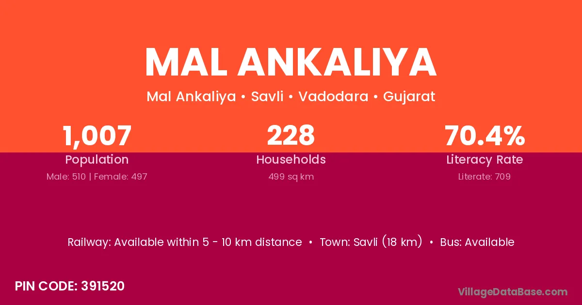 Mal Ankaliya village has a total population of 1,007 people, of which 510 are males and 497 are females.