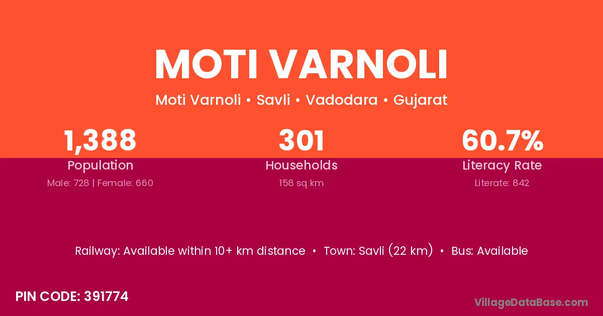 Savli (22 km) is the nearest town to Moti Varnoli village for major economic activities and is located approximately 22 km away.