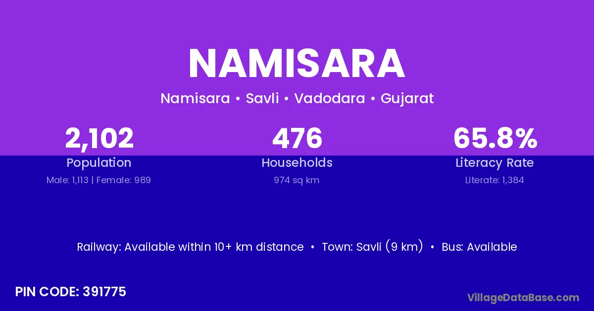 Savli (9 km) is the nearest town to Namisara village for major economic activities and is located approximately 9 km away.