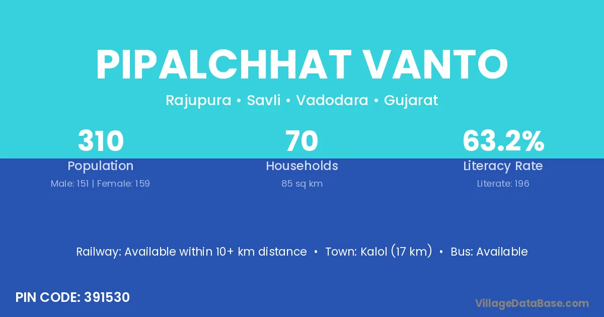Kalol (17 km) is the nearest town to Pipalchhat Vanto village for major economic activities and is located approximately 17 km away.