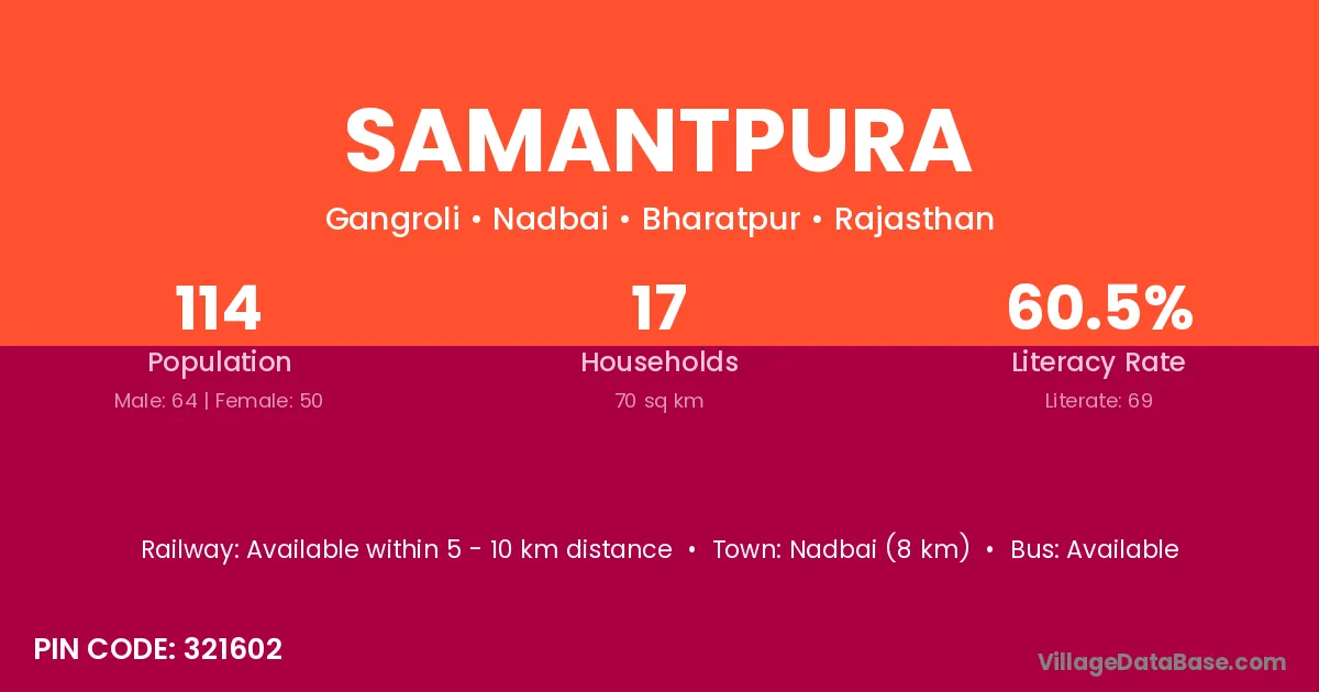 Samantpura village has a total population of 30 people, of which 15 are males and 15 are females.