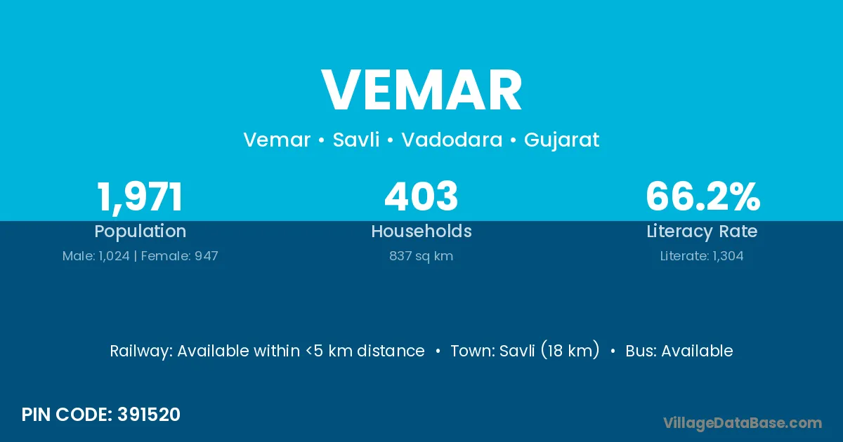 Savli (18 km) is the nearest town to Vemar village for major economic activities and is located approximately 18 km away.