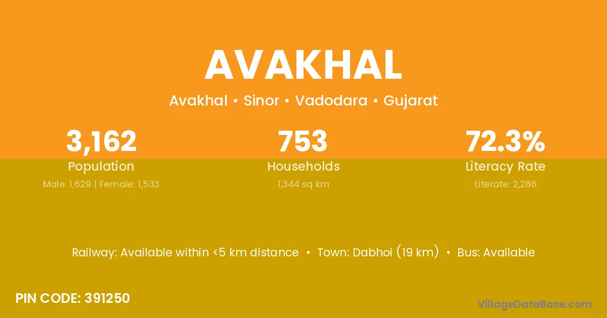Dabhoi (19 km) is the nearest town to Avakhal village for major economic activities and is located approximately 19 km away.