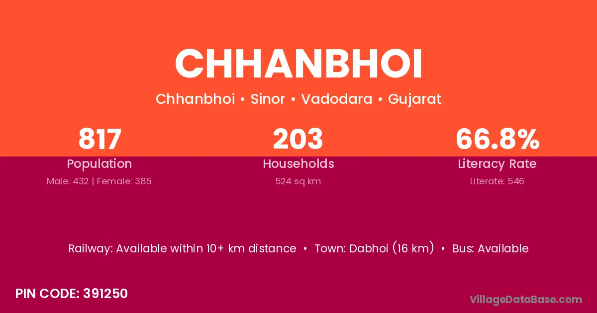 Dabhoi (16 km) is the nearest town to Chhanbhoi village for major economic activities and is located approximately 16 km away.