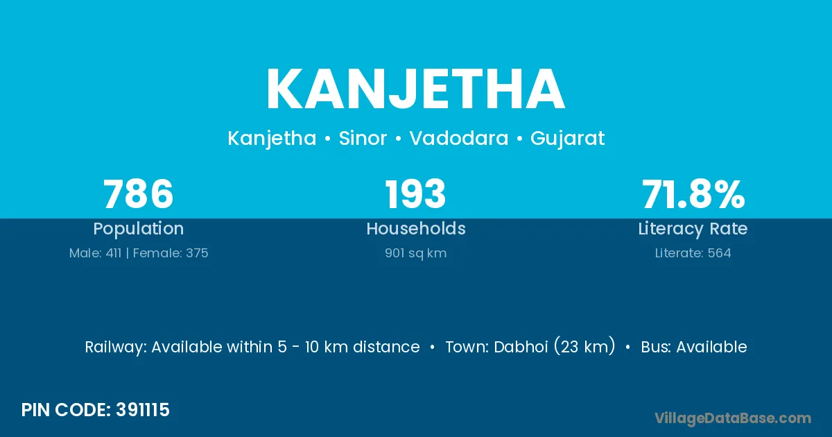 Dabhoi (23 km) is the nearest town to Kanjetha village for major economic activities and is located approximately 23 km away.