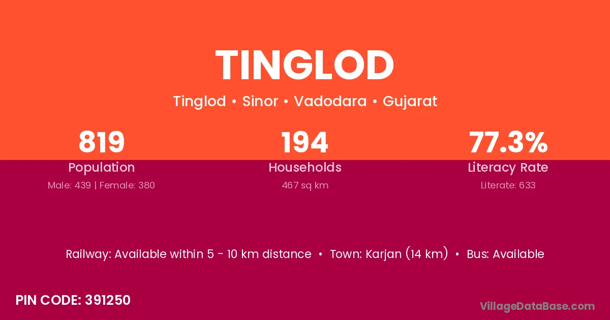 Karjan (14 km) is the nearest town to Tinglod village for major economic activities and is located approximately 14 km away.