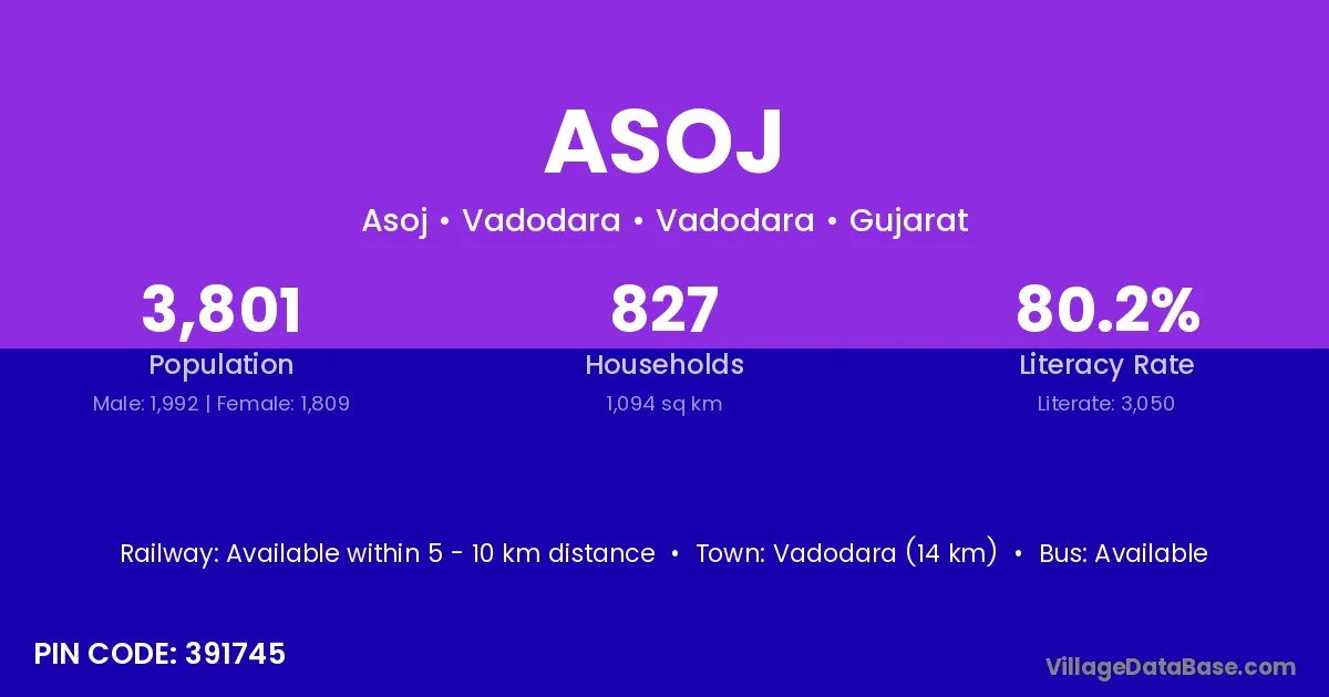 Halol (12 km) is the nearest town to Asoj village for major economic activities and is located approximately 12 km away.