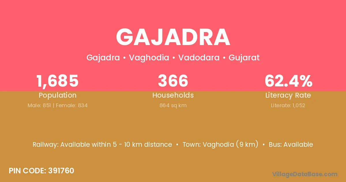 Vaghodia (9 km) is the nearest town to Gajadra village for major economic activities and is located approximately 9 km away.